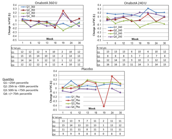 An important related question is whether patients with greater respiratory compromise at baseline show larger decreases in PFTs following onabotA injection. Inspection of change from baseline FVC values by baseline FVC quartile for the 360 U group did not indicate such a relationship.