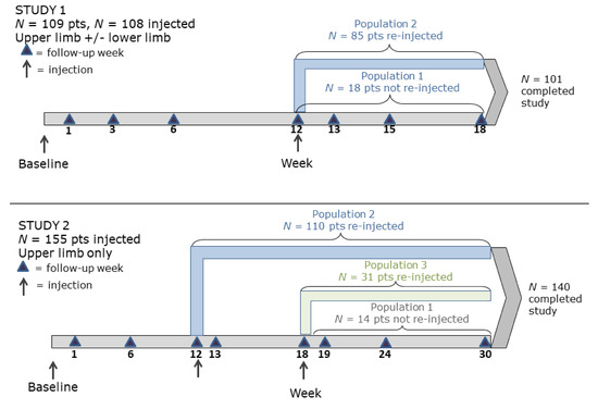 A total of 85 patients were reinjected at week 12, and 18 were not reinjected. In Study 2, the most commonly injected muscles were biceps, brachioradialis, flexor carpi radialis, flexor carpi ulnaris, flexor digitorum profundus, and flexor digitorum superficialis (Table A2). A total of 110 patients were reinjected at week 12, 31 were reinjected at week 18, and 14 were not reinjected.