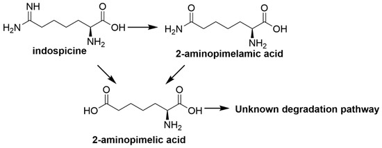 Indigofera spp. are leguminous herbs and shrubs with more than 700 species found mostly in subtropical and tropical regions [121]. These plants are of agronomical importance and widely used as grazing forages and feed supplements as they are rich in protein and palatable to livestock. However, the presence of indospicine in some Indigofera spp. has limited their agronomic potential. Indospicine (2(S)-2,7-diamino-7-iminoheptanoic acid) is a non-protein amino acid analogue of arginine which is present as the free amino acid in Indigofera plants [122]. Ingestion of indospicine was shown to cause severe liver damage to monogastric animals such as dogs, mice and rabbits [123,124,125]. Dogs are highly susceptible to indospicine hepatotoxicity with reported cases of secondary poisoning in dogs consuming indospicine-contaminated meat from horses and camels [126]. Indospicine could not be degraded in mammalian tissue due to the presence of the unusual amidino group as no known mammalian enzymes have the capacity to degrade this functional group [127].