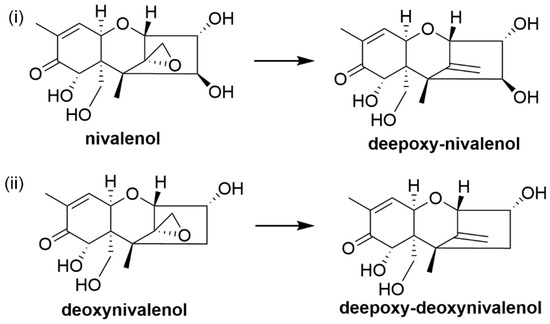 Only types A and B are commonly found in crops which are mainly produced by Fusarium. NIV and DON (Figure 10) are type B trichothecenes which are commonly found in cereals grown in temperate areas of America, Europe and Asia. The maximum allowable level of DON in food and feed set by the European Commission regulation (EU) 1881/2006, amended by the European Commission regulation (EU) 1126/2007 is 1250 µg/kg while the level of NIV was not set in the EU regulation [205]. NIV and DON are chemically stable due to their trichothecene skeleton and the epoxide ring is stable against nucleophilic attack. The epoxide group of trichothecenes is generally considered to be essential for its toxicity [206]. Detoxification of trichothecenes was previously observed when the oxygen in the epoxide group was removed to give a carbon-carbon double bond, resulting in non-toxic de-epoxy metabolites. De-epoxy T-2 toxin was observed to be 200 times less toxic than T-2 toxin in rat skin irritation assay [207]. Furthermore, de-epoxy T-2 toxin metabolites were 50 times less toxic compared to metabolites that had intact epoxides when tested in a brine shrimp LC50 test [208]. Cytotoxicity assays using a BrdU bioassay showed that de-epoxy NIV and de-epoxy DON (DOM-1) had higher IC50 values of 64.2 mM and 83 mM respectively, compared to NIV and DON, which had IC50 value of 1.19 mM and 1.5 mM respectively, suggesting the de-epoxides are less cytotoxic than their corresponding trichothecenes [209]. These studies suggested that the detoxification is a single step reaction where the epoxide is reduced thus reducing the toxicity effect of trichothecenes.