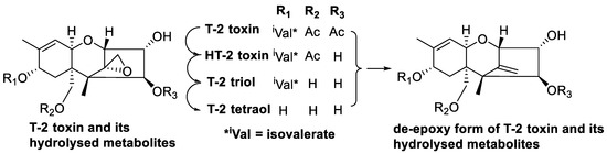 211. Yoshizawa, T.; Takeda, H.; Ohi, T. Structure of a novel metabolite from deoxynivalenol, a trichothecene mycotoxin, in animals. Agric. Biol. Chem. 1983, 47, 2133–2135. [Google Scholar] [CrossRef]