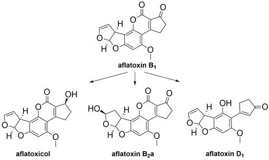 Degradation metabolites of AFB1 have been previously identified. AFB1 metabolites aflatoxicol, aflatoxin B2a (AFB2a) and aflatoxin D1 (AFD1) are degradation products produced by Streptococcus spp. and Lactobacillus spp. which are facultative anaerobes that can be present in the rumen (Figure 14) [87]. In vitro toxicity studies reported that these metabolites were found to be less toxic than AFB1. Aflatoxicol was found to be 18 times less toxic compared to AFB1 but was able to form adducts with DNA. AFB2a is 200 times less toxic than AFB1 and is considered to be relatively non-toxic. AFD1 was found to be non-toxic based on in vitro toxicity studies using Hela cells [87,231,232].