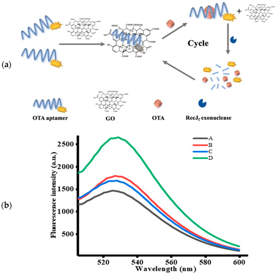 To confirm the feasibility of this aptasensor, the fluorescence emission spectrum of FAM-labeled OTA-apt under different circumstances was studied. Firstly, we investigated the variation in fluorescence intensity without RecJf exo. As can be seen from Figure 1b, a lower fluorescence signal was measured (curve A) with the introduction of OTA-apt and GO, indicating that the fluorescence of FAM was quenched by GO. Previous reports have shown that graphene can be used as a good quencher of organic dyes based on fluorescence resonance energy transfer effect (FRET) from dyes to graphene. Conversely, as depicted in curve B, a prominent fluorescence enhancement was observed upon addition of OTA. This phenomenon indicated that the high affinity of OTA-apt against OTA can induce the formation of OTA/OTA-apt complex, which is a steady antiparallel G-quadruplex structure that can be desorbed from the GO surface and can hinder the FRET from FAM to GO. We further investigated the signal amplification strategy using RecJf exo. In this condition, only a slight increase in background fluorescence (curve C) was monitored compared to curve A without OTA. Nevertheless, in the presence of OTA and RecJf exo, the fluorescence intensity obtained from curve D was stronger than that in the absence of RecJf exo (curve B), which was attributed to RecJf exo-catalyzed hydrolysis of OTA-apt and the release of OTA and the fluorophore. The obtained OTA can combine with another OTA-apt to initiate a new cycle, and, as this proceeds, the amount of fluorophores generated increases. Thus, a small amount of OTA can lead to the release of a considerable amount of fluorophores, dramatically amplifying the fluorescence signal. Above all, these intriguing results suggest that this signal-amplifying aptasensor can be successfully applied to OTA assay.