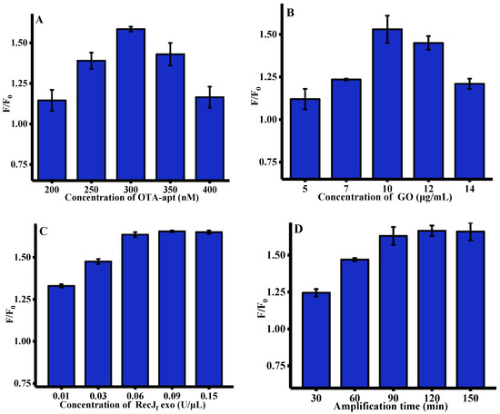 Optimization of experimental conditions for OTA assay (n = 3). (A) Concentration of OTA-apt, (GO) = 10 μg/mL, RecJf exo = 0.2 U/μL, (Amplification time) = 90 min, (OTA reaction time) = 15 min; (B) concentration of GO, (OTA-apt) = 300 nM, (RecJf exo) = 0.2 U/μL, (Amplification time) = 90 min, (OTA reaction time) = 15 min; (C) concentration of RecJf exo, (OTA-apt) = 300 nM, (GO) = 10 μg/mL, (Amplification time) = 90 min, (OTA reaction time) = 15 min; (D) amplification time, (OTA-apt) = 300 nM, (GO) = 10 μg/mL, (RecJf exo) = 0.06 U/ μL, (OTA reaction time) = 15 min. F0 and F were the fluorescence intensities in the absence and presence of OTA. (OTA) = 500 ng/mL, (excitation wavelength) = 490 nm, (emission wavelength) = 525 nm. Error bars represented the standard deviation of three experiments.