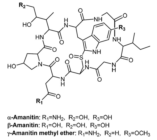 - Zilker, T.; Faulstich, H. Cyclopeptide-Containing Mushrooms: The Deadly Amanitas. In Critical Care Toxicology: Diagnosis and Management of the Critically Poisoned Patient, 2nd ed.; Brent, J., Burkhart, K., Dargan, P., Hatten, B., Megarbane, B., Palmer, R., White, J., Eds.; Springer International Publishing: Cham, Switzerland, 2017; pp. 2129–2148. [Google Scholar] [CrossRef]