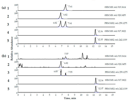 Extracted ion chromatograms (MH+) of matrix-matched quality control samples ((a) = 2000 pg/mL, (b) = 20 pg/mL) of α-amanitin (m/z = 919.3614 at 7.61 min in (a)1 and 7.57 min in (b)1), β-amanitin (m/z = 920.3614 at 6.82 min in (a)2 and (b)2), and the internal standard (IS) γ-amanitin methyl ether (m/z = 917.3822 at 12.36 min in (a)4 and (b)4). The ion chromatograms of the characteristic fragment ions for the identification of α- and β-amanitin in MS2 are shown in (a)3 and (b)3. The ion chromatograms of the characteristic fragment ions for the identification of the IS are shown in (a)5 and (b)5. The mass deviation was set to 5 ppm.