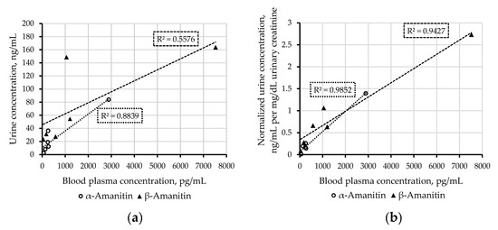 (a) Urinary concentrations (ng/mL) of α-and β-amanitin in patient case samples plotted against concentrations (pg/mL) in matched blood plasma samples; (b) creatinine-normalized urinary concentrations ((ng/mL)/(mg/dL)) of α-and β-amanitin in patient case samples plotted against concentrations (pg/mL) in matched blood plasma.