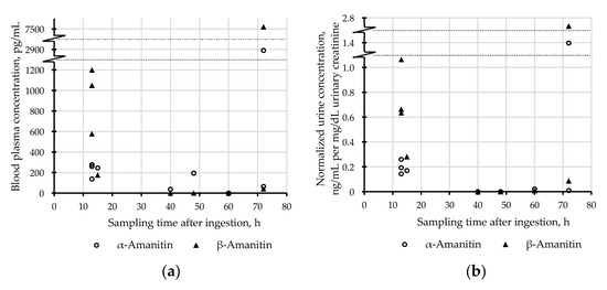 Figure 3 illustrates the correlation of plasma concentrations with uncorrected (Figure 3a) and creatinine-normalized urinary concentrations (Figure 3b). Creatinine-normalized urinary concentrations showed a better linear correlation and may thus be more comparable with plasma concentrations and therefore more suitable for interpretation than uncorrected ones. Furthermore, the effects of urine dilution, e.g., caused by therapy measures such as forced diuresis, can be normalized. This in turn allows us to compare results with creatinine normalized values of other studies. Thus, concentrations of amatoxins in urine should be published together with urinary creatinine. The time window of sampling after ingestion of the mushroom meal varied from 13 to 72 h. It must be kept in mind that this information, as well as the suspected amounts of ingested mushrooms, is based on patient information, and should be taken with care. A rapid decrease of toxin concentrations in both matrices can be observed when comparing values from samples collected after 13–15 h to samples collected after more than 40 h (Figure 4). It would be interesting to have data from more samples, particularly sampled before 13 h and between 15 and 40 h in order to make further conclusions. The determined concentrations of amatoxins in samples of case 9 seemed to be comparatively high, especially, when the late sampling time of approximately 72 h is considered. This patient suffered already from multi-organ failure when the samples were taken and shortly died afterward before liver transplantation could be realized. Such uncommon early deaths in the course of amatoxin poisoning were also described by Zilker and Faulstich [13]. For therapeutic reasons, it would be interesting to know, whether late-arising or persisting high concentrations of amatoxins in the blood may indicate a multi-organ failure.
