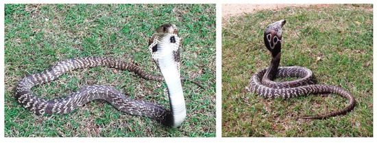 Snake envenoming is a leading reason for morbidity and mortality in the rural tropics around the globe [1]. Approximately 375 snake species around the world are venomous and are considered dangerous [2,3,4]. Although an accurate figure of the burden of global snakebites is unavailable, an estimate of 5.5 million annual snakebites across the globe is considered realistic [5]. Sri Lanka has one of the highest rates of snakebite incidence in the world. There are about 100 species of snake on the island [6,7]. However, the high morbidity and mortality from snake envenoming is due to snakebites in dogs in Sri Lanka, resulting from four species, namely, cobra (Naja naja), Russell’s viper (Daboia russelii), and hump-nosed viper (genus Hypnale) [8]. The spectacled cobra is the only member of the genus Naja reported in Sri Lanka (Figure 1) [9]. The body of this cobra is long and cylindrical and can be as long as 1.8 m. The color of the hood and body vary greatly according to the environment that they inhabit [9,10,11]. This snake is commonly seen in the ecosystems of coastal plains and in mountain regions at elevations up to 1500 m [12]. Records regarding envenoming in man are abundant: pain, swelling, blister formation, and hemorrhagic necrosis are the symptoms generally seen following a snakebite in man [13]. Severe localized tissue necrosis, pain, and swelling are produced due to the toxins contained in the cobra venom [14]. Bites by N. naja can cause significant local swelling and sometimes cause severe local necrosis in man and animals. Immediate severe local pain and blister formation, bleeding from the bitten site, as well as lymphadenitis have been observed [15]. Phospholipase A2 and cytotoxins are the principal toxic compounds in cobra venom, causing cardiotoxicity, myotoxicity, neurotoxicity, and hemolysis [16]. Anticoagulant factors present in cobra venom lead to destruction of tissue thromboplastin, which exerts an anticoagulant effect and causes bleeding [17]. Snakebite in animals generally occurs while grazing, hunting, or playing in gardens [18]. Despite the fact that snakebites in canine patients are not well documented, dogs are the commonest snakebite victims encountered in veterinary practice [18,19]. Clinical features of envenoming on admission depend on the dose and type of venom; the anatomical site and number of bites; the age, size, and health status of the victim; and the time between the bite and admission for veterinary care [20]. Irrespective of the wide variety of snakes, snake venoms share many common toxin groups, including neurotoxic PLA2 and three-finger toxins [21].