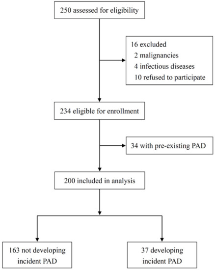 The original number of participants included 250 patients, of which 2 were excluded due to active malignancy, 4 were excluded for active infectious disease, and 10 refused to participate (Figure 1). Table 1 summarizes the baseline characteristics of 234 patients divided by PAD status. The mean age was 63 ± 13 years, 54.7% were male, and the median dialysis vintage was 2.4 (interquartile range, 1.4–3.7) years. Overall, 44.0% (n = 103) had diabetes, 32.5% (n = 76) had cardiovascular disease (CVD), and 14.5% (n = 34) had pre-existing PAD. Patients with PAD were older and more likely to have diabetes and concomitant CVD. As expected, ankle-brachial index (ABI) was significantly lower in this group, and prescription rates of antiplatelets and statins were significantly higher. Notably, major traditional risk factors for PAD, including male sex, smoking history, body mass index (BMI), systolic blood pressure (BP), triglycerides, and the total cholesterol (TC): high-density lipoprotein cholesterol (HDL-C) ratio, did not differ between patients with and without PAD. There were also no significant differences in other risk factors for PAD reported in the CKD population, such as dialysis vintage, plasma phosphate, intact parathyroid hormone (PTH), and C-reactive protein (CRP) levels between the 2 groups. A total of 200 patients who were free of PAD were followed for clinical outcomes from 1 September 2008, to 30 June 2020.