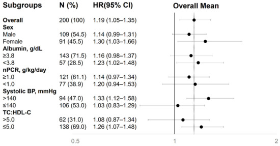 We performed subgroup analysis to explore the association between indoxyl sulfate and incident PAD in the cohort stratified by sex, albumin (≥3.8 vs. <3.8 g/dL), normalized protein nitrogen appearance (nPCR) (≥1.0 vs. <1.0 g/kg/day), systolic BP (>140 vs. ≤140 mmHg), and the TC:HDL-C ratio (>5.0 vs. ≤5.0) (Figure 2). The increased risk of PAD associated with indoxyl sulfate was consistent across all clinically relevant subgroups (p for interaction >0.05 for all).