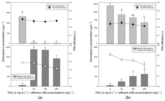 (a) Percentage of chlorophyll-a removal in P. rubescens suspensions with different chlorophyll-a concentrations (25–200 µg L−1) after 1 h exposure to different LMB concentrations mixed with the coagulant PAC (2 mg Al L−1). (b) Percentage of chlorophyll-a removal in P. rubescens suspensions with different chlorophyll-a concentrations (25–200 µg L−1) after 24 h exposure to different LMB concentrations mixed with the coagulant PAC (2 mg Al L−1).