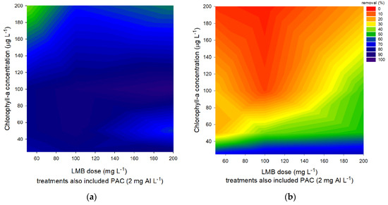 A laboratory experiment using different concentrations of cyanobacteria and ballast was performed to examine how effective cyanobacterial biomass could be precipitated with PAC and LMB. The results after 1 h showed that 100 mg LMB L−1 sufficed to settle even the highest chlorophyll-a concentration used (200 μg chlorophyll L−1), while lower biomass could still be precipitated effectively using around 50 mg LMB L−1 (Figure 2a). However, the results after 24 h showed much lower removal and strongly hampered efficiency; even at low biomass, high amounts of ballast could only maximally remove 76% of the chlorophyll-a concentration (Figure 2b).