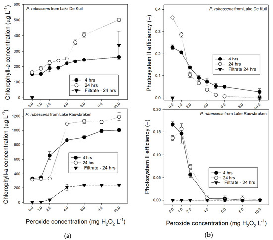 (a) Chlorophyll-a concentrations (μg L−1) in 25 mL P. rubescens suspensions from Lake De Kuil (top panel) and Lake Rauwbraken (bottom panel) after 4 h exposure (filled circles) and 24 h exposure (open circles) to different concentrations hydrogen peroxide (0–10 mg L−1). Also included are the chlorophyll concentrations determined in 0.45 µm filtered samples after 24 h (triangles). Note that for Lake De Kuil these were only tested for the controls (0 mg L−1) and the 10 mg H2O2 L−1 treatment. Error bars indicate 1 SD (n = 3). (b) Photosystem II efficiencies of P. rubescens suspensions from Lake De Kuil (top panel) and Lake Rauwbraken (bottom panel) after 4 h exposure (filled circles) and 24 h exposure (open circles) to different concentrations hydrogen peroxide (0–10 mg L−1). Also included are the Photosystem II efficiencies determined in 0.45 µm filtered samples after 24 h (triangles). Error bars indicate 1 SD (n = 3).