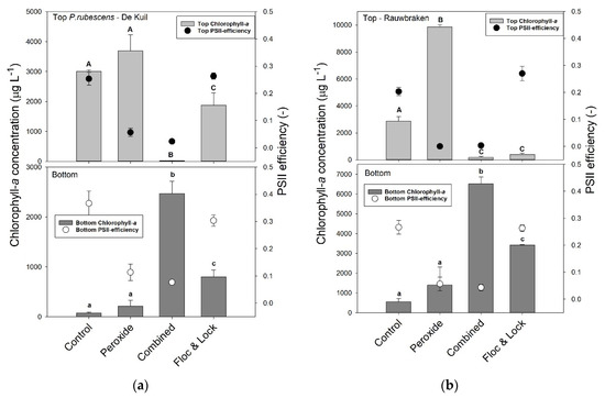Chlorophyll-a concentrations (μg L−1) in the top 2 mL (top light grey bars) and bottom 2 mL (lower dark grey bars) of 100 mL cyanobacteria suspension from (a) Lake De Kuil and (b) Lake Rauwbraken after 24 h exposure to hydrogen peroxide (5 mg L−1), peroxide + coagulant (2 mg Al L−1) and ballast (200 mg LMB L−1) (combined) or only coagulant (2 mg Al L−1) and LMB (Floc & Lock). Also included are the Photosystem II efficiencies (PSII) of the cyanobacteria collected at the water surface (filled circles) and at the bottom (open circles). Error bars indicate 1 SD (n = 3). Similar letters indicate homogeneous groups that are not different at the p < 0.05 level.