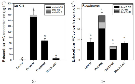The exposure of P. rubescens suspensions collected from Lake De Kuil to hydrogen peroxide caused a sharp increase in the concentration of extracellular microcystins (MCs) of which the variant dmMC-RR was most abundant (Figure 5a). The one-way ANOVA indicated significant differences (F3,11 = 226.1; p < 0.001); extracellular MC was lowest in control and Floc and Lock treatments and the highest in the solely peroxide treatment (Figure 5a). In the combined treatment, extracellular MC concentration was about 60% lower than in the sole peroxide treatment (Figure 5a). In suspensions with P. rubescens from Lake Rauwbraken only exposure to solely hydrogen peroxide caused significantly (F3,11 = 78.0; p < 0.001) elevated extracellular MC concentrations (Figure 5b).