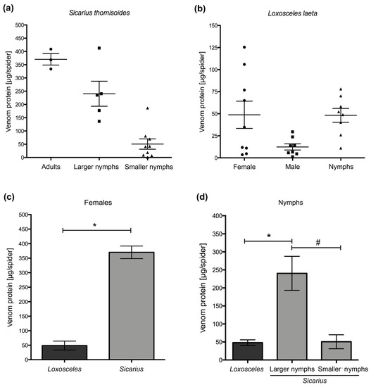S. thomisoides venom protein quantitation. (a) Venom protein (μg/spider) distribution of S. thomisoides adults (n = 3), larger nymphs (n = 5), and smaller nymphs (n = 9). (b) Venom protein (μg/spider) distribution of Loxosceles laeta in adults: female (n = 9) and male (n = 8) and nymphs (n = 8). (c) Comparison of the venom protein (μg/spider) between S. thomisoides and L. laeta female specimens. (d) Comparison of the venom protein (μg/spider) between S. thomisoides and L. laeta nymph specimens. The results were expressed as the means ± SD. (*) Statistical significance (p < 0.05) between venom protein means of females from S. thomisoides and L. laeta. (#) Statistical significance (p < 0.05) between the venom protein means of L. laeta nymphs and S. thomisoides small nymphs.