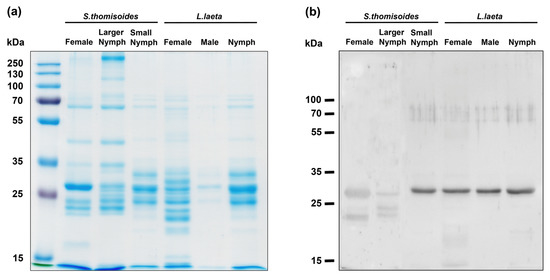 Electrophoretic pattern of S. thomisoides venom and phospholipase D detection by Western blotting. (a) Venoms (10 µg) in the females and nymphs of S. thomisoides were subjected to 12% SDS-PAGE and compared with 10 µg of venom from females, males, and nymphs of L. laeta. (b) The venoms were detected by Western blotting using mouse polyclonal serum against rLlPLD1 from L. laeta diluted 1:1000, followed by anti-mouse IgG (H + L)-HRP conjugate diluted 1:40,000 and developed using electrochemiluminescence (ECL).