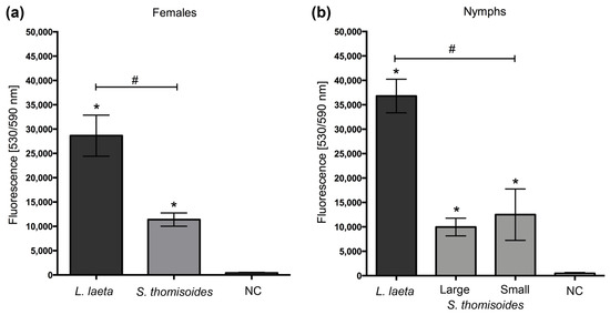 Comparison of phospholipase D activity between the S. thomisoides and L. laeta venoms. (a) Female venoms. (b) Nymphs venoms. The results were expressed as the means ± SEM. (*) Statistical significance (p < 0.05) between the means of L. laeta or S. thomisoides venoms compared with the negative control (NC). (#) Statistical significance (p < 0.05) between the means of L. laeta and S. thomisoides venoms.