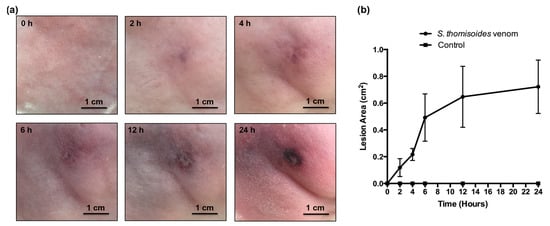 Dermonecrosis assay of S. thomisoides venom. (a) The pooled venom of females of S. thomisoides (50 µg) was inoculated into the rabbit skin, and a lesion was recorded between 2 and 24 h post inoculation. Scale bar = 1 cm. (b) The lesion areas (cm2) from three treated rabbits were measured and graphed. Control: PBS-treated rabbits.