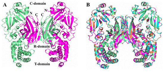 DT was crystallized under varying buffer conditions in an effort to determine if conformational changes, particularly in the T-domain, are observed with a decreasing pH. Since the crystallization conditions were identical except for the buffer, the crystals of DT-5.0, DT-5.5, DT-6.0, and DT-7.0 have similar unit cell dimensions and diffraction resolutions (Table 1). This represents a new crystal form of DT. However, the α-angle for DT-5.0 is approximately 4° larger than that of other crystals. The overall structure of this crystal form is similar to previously determined structures [26,27] and forms a domain-swapped dimer (Figure 2a). The structures of DT at various pH values were superimposed onto DT-5.0 using GESAMT in order to compare their similarities/differences. Overall, all of the structures are very similar (Figure 2b), with RMSD deviations between the Cα atoms of 0.34 Å (997 residues, DT-5.5), 0.38 Å (999 residues, DT-6.0), and 0.41 Å (1000 residues, DT-7.0).