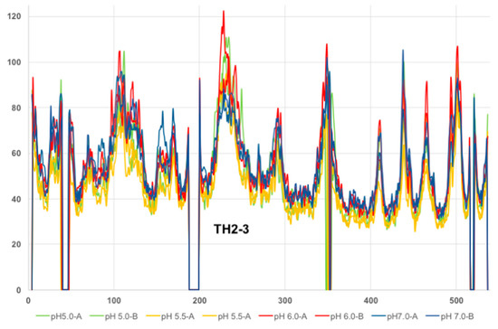 Our earlier MD study of the isolated T-domain revealed that histidine protonation, while not accompanied by the loss of structural compactness of the protein, nevertheless drives substantial molecular rearrangements characterized by the partial loss of secondary structures due to the unfolding of helices TH1 and TH2 and the loss of close contact between the C- and N-terminal segments [11]. While the high-resolution structures at a low pH presented here confirm the unfolding of TH2 (Figure 3 and Figure 4), no changes in the structure of TH1 nor in its proximity to TH1 at pH 7.0–5.0 have been observed (Figure 5a and Figure S2). This warrants a closer look at the computational and experimental characterization of the structure of the isolated T-domain presented below.