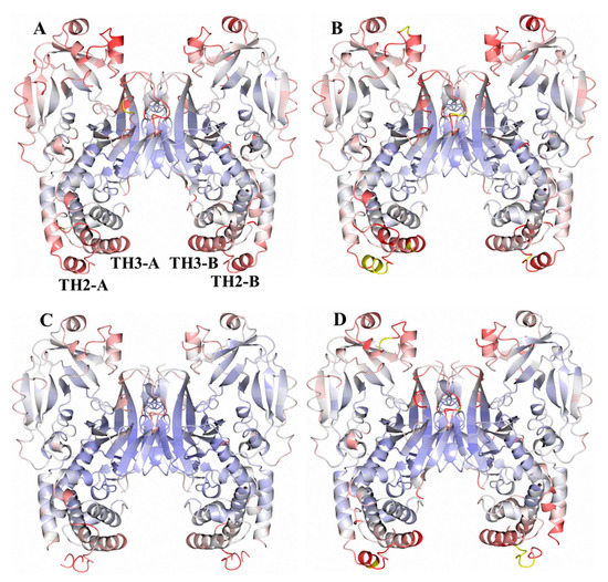 Structures of DT dimers colored by B-factor. (A) pH 7, (B) pH 6, (C) pH 5.5, (D) pH 5. The B-factor scale ranges are 0 Å2 (blue), 50 Å2 (white), and 100 Å2 (red). Residues with B-factors greater than 100 Å2 are colored yellow. The TH2 and TH3 helices are indicated in panel A for subunits A and B.
