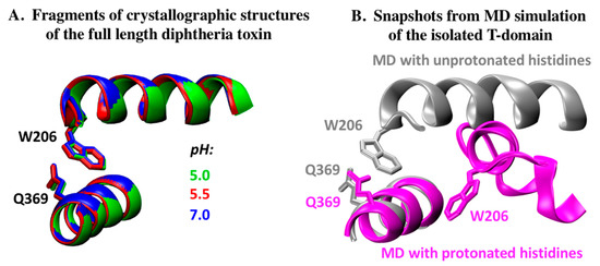 - Kurnikov, I.V.; Kyrychenko, A.; Flores-Canales, J.C.; Rodnin, M.V.; Simakov, N.; Vargas-Uribe, M.; Posokhov, Y.O.; Kurnikova, M.; Ladokhin, A.S. pH-triggered conformational switching of the diphtheria toxin T-domain: The roles of N-terminal histidines. J. Mol. Biol. 2013, 425, 2752–2764. [Google Scholar] [CrossRef] [PubMed]