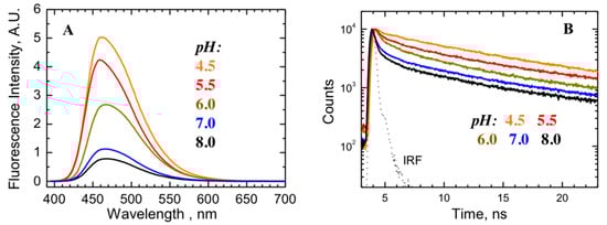 Fluorescence-based proximity measurements between bimane probe attached to a single cysteine mutant at position 369 (Q369C mutant) and residue W206. The short-range aromatic quenching of bimane steady-state (A) and time-resolved fluorescence (B) indicates close proximity in the folded structure at neutral pH. The Instrument Response Function (IRF) is shown as a dotted line. The reduction in quenching observed at an acidic pH indicates the loss of close packing between the N- and C-termini of the T-domain, also observed in the MD simulation (see Figure 5b and [11]).
