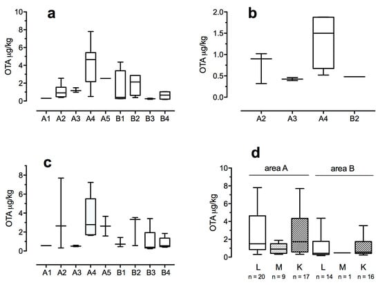 OTA levels in liver (a), muscle (b), and kidney (c) samples with detectable concentrations of OTA (>LOD) in wild boars from different sub-areas (A1–A5; B1–B4). OTA levels in liver (L), muscle (M), and kidney (K) samples with detectable concentrations of OTA (>LOD) in wild boars from area A and B (d); n indicates the number of samples with OTA > LOD.