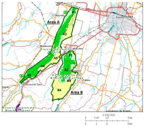 The territories occupied by the “Taro Regional Park” and by the “Boschi di Carrega Regional Park” were respectively named area A (20 km2) and area B, (12.7 km2). The two areas are geographically neighboring, but differ from one another for environmental conditions, and are mutually isolated by the presence of a highway, an infrastructure that represents a hardly surmountable border for ungulates (Figure 2). Five sub-areas (A1–A5), indicating the specific capture sites, are identifiable in area A, and four in area B (B1–B4); 26 wild boars were sampled in area A and 38 in area B.