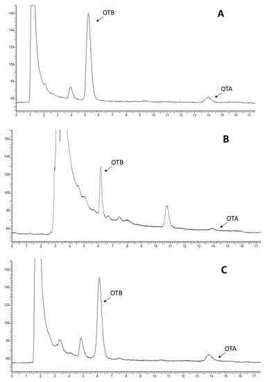 HPLC-FLD chromatograms of liver (A), muscle (B), and kidney (C) naturally contaminated with OTA.