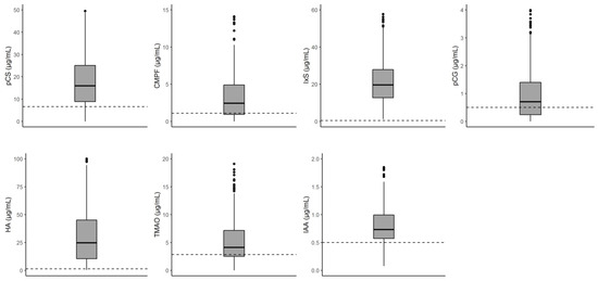 The mean ± SD reference values for subjects with normal kidney function were 6.6 ± 3.7 µg/mL for pCS, 1.1 ± 1.1 µg/mL for CMPF, 0.5 ± 0.3 µg/mL for IxS, under limit of quantification for pCG, 1.3 ± 1.6 µg/mL for HA, 0.5 ± 0.2 for IAA [34], and 3.3 (3.1–6.0) for TMAO [35].