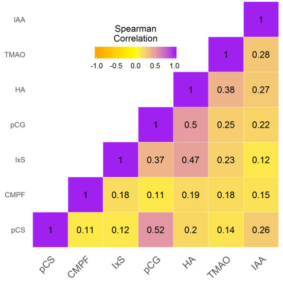 Correlation matrix for UT concentrations at baseline. CMPF, 3-carboxy-4-methyl-5-propyl-furanpropionic acid; HA, hippuric acid; IAA, indole-3-acetic acid; IxS, indoxylsulfate; pCG, p-cresylglucuronide; pCS, p-cresylsulfate; TMAO, trimethylamine-N-oxide.
