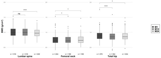 Twelve and 24 months after transplantation, the BMD had decreased significantly (vs. M1) at all measurement sites, with the exception of the lumbar spine at M12 (Figure 3, Table S2).