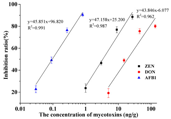The optimal mycotoxin calibration curves for the three mycotoxins in the detection assay.