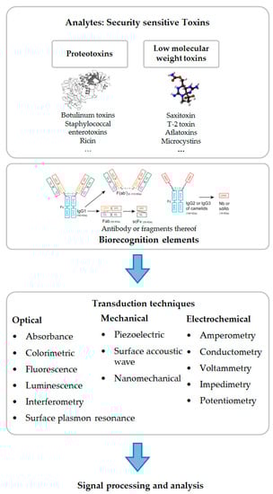 General overview of immunosensor components for detection of security sensitive toxins as analyte (3D structure model of ricin (pdb: 2AAI []) as well as a ball-and-stick model of saxitoxin are depicted). Because this review is focused on immunosensors, antibodies (or fragments of antibodies) (VL: variable light chain; VH: variable heavy chain; CL: constant light chain; CH: constant heavy chain; Fab: antigen binding fragment; scFv: single-chain variable fragment; VHH: variable domain of heavy chain antibody; Nb: nanobody; sdAb: single domain antibody) are depicted as biorecognition elements only (Adapted from []. MDPI (2014)). For the sake of completeness, it should be noted that alternative biorecognition elements, such as aptamers, natural receptor proteins, carbohydrates or cell-based receptors, could also be employed for toxin detection. Several examples of possible transduction mechanisms are noted as well as signal processing.