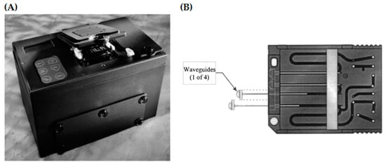 (A) Picture of the portable, four channel fluorimetric RAPTORTM assay system (Reprinted from Biosensors and Bioelectronics, 14, Anderson, G.P.; King, K.D.; Gaffney, K.L.; Johnson, L.H., Multi-analyte interrogation using the fiber optic biosensor, 771–777, Copyright (2000), with permission from Elsevier). (B) Scheme of a RAPTORTM assay coupon depicting orientation of optical fibers (Reprinted from Biosensors and Bioelectronics, 14, Anderson, G.P.; King, K.D.; Gaffney, K.L.; Johnson, L.H., Multi-analyte interrogation using the fiber optic biosensor, 771–777, Copyright (2000), with permission from Elsevier).