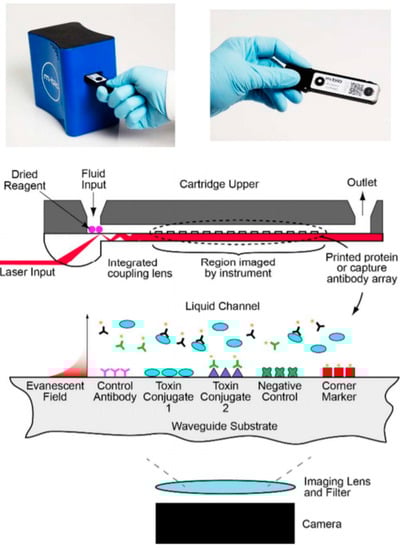The LightDeck® technology developed by MBio Diagnostics (Boulder, CO, USA; https://mbiodx.com/) relies on planar waveguide microarray technology and fluorescence imaging. Illumination is done by a solid-state diode laser (639 nm). A disposable injection-molded plastic cartridge contains a laser light-coupling lens which directs the laser light down the plastic substrate. The multimode waveguide generates an evanescent illumination field at the microarray surface. Due to the evanescent field illumination, interference from cells or unbound fluorophores are minimized allowing one to conduct assays in the presence of complex sample matrices without washing steps [,]. Bickman et al. [] demonstrated the application of this planar waveguide technology for duplex detection of low molecular weight toxins microcystin and cylindrospermopsin applying a fluorescent competitive immunoassay in a disposable cartridge. The disposable cartridge is analyzed using the portable and battery powered MBio MQ reader (Figure 3). An automated assay workflow requiring 10 min assay time achieved LODs of 0.4 ng/mL for microcystin and 0.7 ng/mL for cylindrospermopsin []. Up to now, the technology was applied only for environmental detection purposes; however, it exhibits potential also for multiplex detection of security sensitive proteotoxins and low molecular weight toxins in the field of biosecurity.