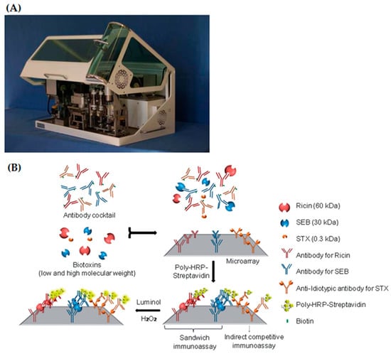 (A) Chemiluminescence instrument MCR3 for multiplex microarray analysis (Reprinted by permission from Springer Customer Service Centre GmbH: Springer, Analytical and Bioanalytical Chemistry [], Copyright (2014)). (B) Schematic representation of sandwich (for SEB and ricin) and indirect competitive (for saxitoxin) immunoassays combined in the same microarray chip by using anti-idiotypic antibodies (Reprinted from []. Published by The Royal Society of Chemistry, 2014).