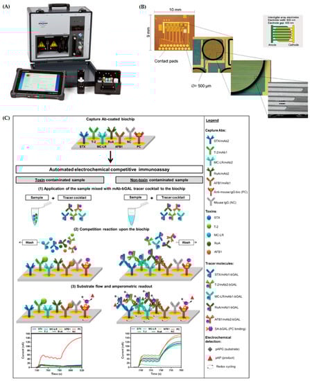 (A) Portable BioDetector integrated (pBDi) with sample holder and reagents holder as well a Tablet PC with control software running. (B) Electrochemical biochip layout with interdigitated electrode structure (Reprinted with permission from []. Copyright (2006) American Chemical Society). (C) Assay scheme of multiplex competitive immunoassay for detection of security relevant low molecular weight toxins (Reprinted from []. MDPI (2019)).