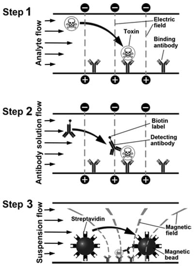 Schematic assay workflow for an “active” sandwich immunoassay relying on magnetic bead labels. Step 1: electrophoretic capturing of bacterial proteotoxins on a microarray solid surface from flow-through. Step 2: active electrophoretic labeling of the captured analyte by addition of corresponding biotinylated detection antibodies. Step 3: Microscopic detection of the microarray-bound biotin labels by addition of streptavidin-coated magnetic beads in a shear-flow and magnetic field (Reprinted with permission from []. Copyright (2012), American Chemical Society).