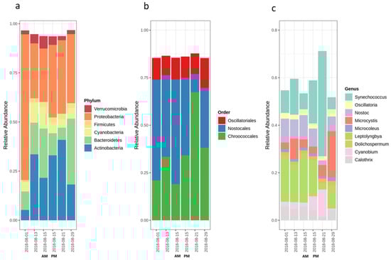 Identity of major detected bloom-associated cyanobacterial community members during the sampling period: (a) relative abundance of the different phylum, (b) the relative abundance of orders belonging to cyanobacterial phylum, (c) relative abundance of genera belonging to the Nostocales, Chrooccocales and Oscillatoriales orders.
