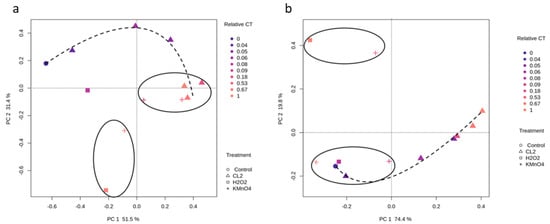 For the cyanobacterial community (1 August), principal axis one, and principal axis two for PCA represent 74.4 and 19.8% of the variation among the samples, respectively (Figure 2b). A clear trend in the cyanobacterial composition variation is observed following chlorination. Cyanobacterial composition after exposure to Cl2 (low relative CT < 0.05), KMnO4 (low and high relative CT), H2O2 (low relative CT = 0.08) oxidation clustered in the same group with the control condition. High-relative (CT = 1) using H2O2 and (mid-relative = 0.53) KMnO4 are grouped in a distinct second cluster, revealing similar cyanobacterial assemblages. This is in contrast with cyanobacterial/bacterial community trends following chlorination that display a progressive shift. Differences between the observed trends for the three oxidants were expected because of different mechanisms of actions and kinetics, persistence and selectivity. Cell count based studies show progressive shifts following oxidation [,]. Moreover, selective cyanobacteria oxidation has been demonstrated in the lab [,], in the field [,], and in drinking water treatment plants [,].