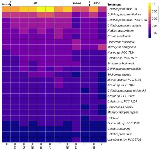 Cyanobacterial species heat map following the oxidation using Cl2 (0.6 mg/L), KMnO4 (5 mg/L), H2O2 (10 mg/L) (1 August 2018).