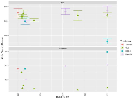 The doses (concentration) and contact time (T) were selected using the product CT, which is the foundation of disinfection and oxidation in drinking water. The choice of CT also considered prior evidence showing differences in species’ resistance to the oxidant exposure (CT) [,,,,,,,,,]. However, all previously reported observations were based on taxonomic cell counts and not on high throughput sequencing. The applied dosages reflect drinking water industry practices using regulated treatment processes.