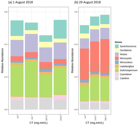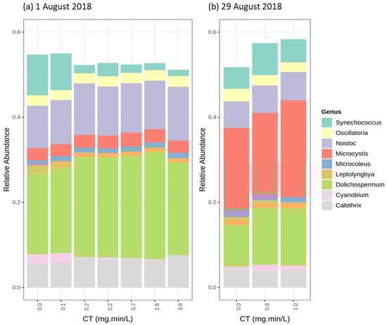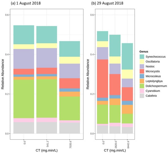 Relative abundance of the most abundant genus following H2O2 (10 mg/L) oxidation on (a) 1 August 2018 (Dolichospermum genus abundant) (b) 29 August 2018 (Microcystis genus abundant).