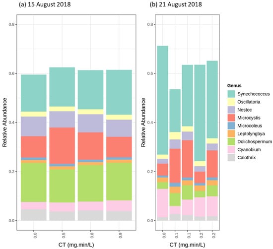 Relative abundance of the most abundant genus following O3 (0.3 mg/L and 0.1 mg/L) oxidation (a) 15 August 2018 (Dolichospermum genus Abundant), (b) 21 August 2018 (Synechococcus genus abundant).