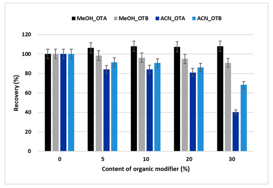 The ochratoxins A and B are weak organic acids; their formulas are presented in Figure S1. The pKa values for OTA are 3.1 for the carboxylic acid group, 7.9 for the hydroxyl group [33], and 3.3 for the carboxyl group, while the pKa value for the hydroxyl group of OTB is 7.0 [34]. Therefore, all the mobile phases were acidified with a 0.5% acetic acid solution to pH 2.8 to avoid ochratoxin ionization and increase their retention. The optimization of extraction was focused on the fast removal of all interferences while retaining the target compounds. First, the aqueous washing mobile phases with increasing percentages of acetonitrile or methanol were tested. The recovery of both ochratoxins in the absence of organic solvent was set as 100% because water has the lowest elution strength in a reversed phase system comparing to organic solvents, so the least loss of analytes is expected. Acetonitrile is a much stronger eluent. Hence, the partial loss of OTB for the 1 min washing step was observed even when using a 5% aqueous solution. The effect of the washing mobile phase composition on the ochratoxin recovery is presented in Figure 1. Finally, 30% methanol appeared to be a good compromise between the sufficient recovery of both ochratoxins and the ability to remove an interfering matrix. A comparison of chromatograms using pure water, 30% aqueous methanol, and 10% aqueous acetonitrile in the washing mobile phase is demonstrated in Figure 2 under the optimized chromatographic conditions (Section 5.4).