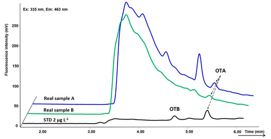 The collection of all wines, 8 mL from each sample in a dark vial, was kept at 4 °C before the chromatography analysis. Blank Tokaj wine not containing ochratoxins used for the optimization and validation of the method was purchased in a local supermarket and spiked with a standard solution. The absence of contamination by OTA and OTB below the LOD or the absence of any other interference eluted in the same retention time was confirmed by chromatographic analysis (see Figure 3).